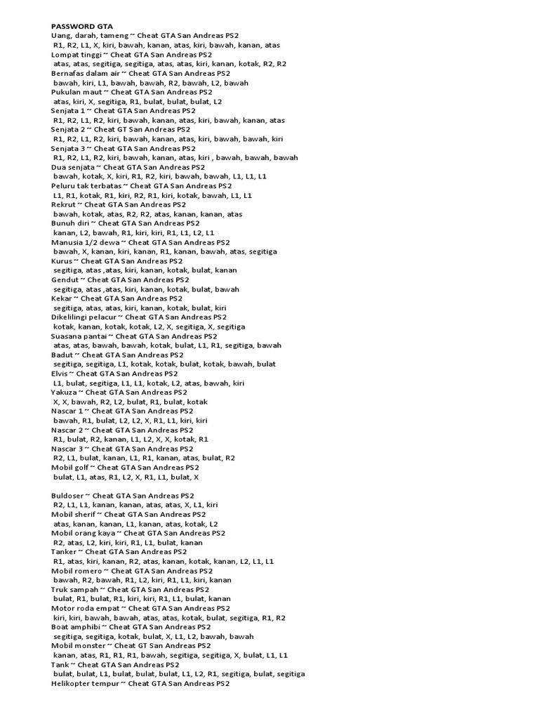 Gta San Andreas Pdf Document from reader020.staticloud.net Keterangan kode gta ps2 diatas! Itulah brow 103 password gta ps2 terlengkap , jika kurang lengkap silahkan komen dibawah nanti akan saya tambahi lagi cheat gta nya , oh iya jika butuh password ps2 yang lain , silahkan request ya. These are all of the cheats for grand theft auto san andreas.the cheats available work on all playstattion systems please like and subsribe for more videos. Kepopuleran game gta sa tentu karena gameplay dan misi yang sangat seru. (bahasa indonesia), cheat gta san andreas. Kombinasi password gta ps2 pun sangat. Buat kamu penggemar game gta di ps2 berikut ini adalah kode2 cheat gta san andreas untuk ps2 lengkap. Oke,,,kali ini saya akan membahas tentang cheat,kode,atau password gta sa (ps2).